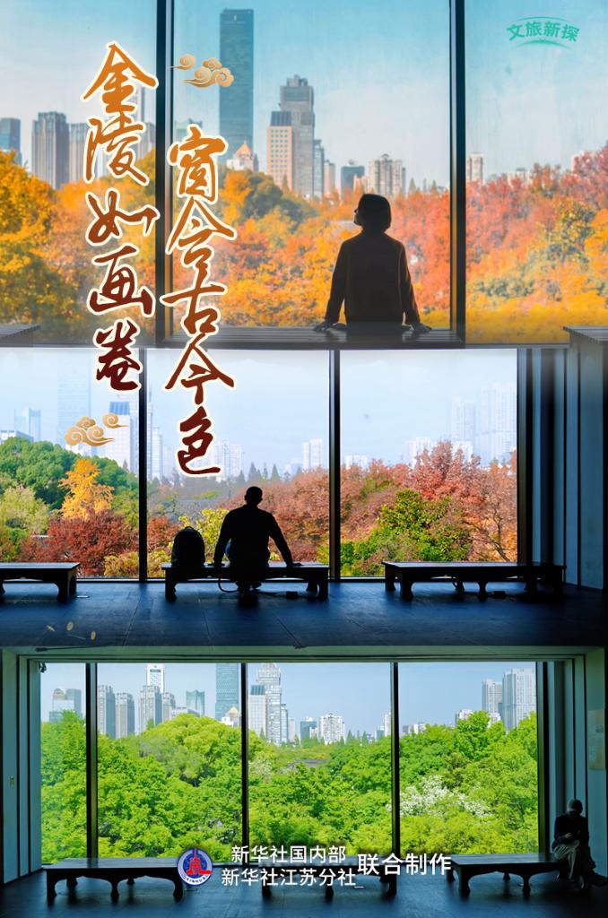 金黄的银杏、翠绿的松柏、赭红的枫叶、多彩的乌桕错落成景,叶脉缀着薄光,洒作一地的碎金,风过时,落叶如蝶……位于江苏省南京市玄武区的六朝博物馆三楼的“金陵之窗”迎来一年中的“高光时刻”。