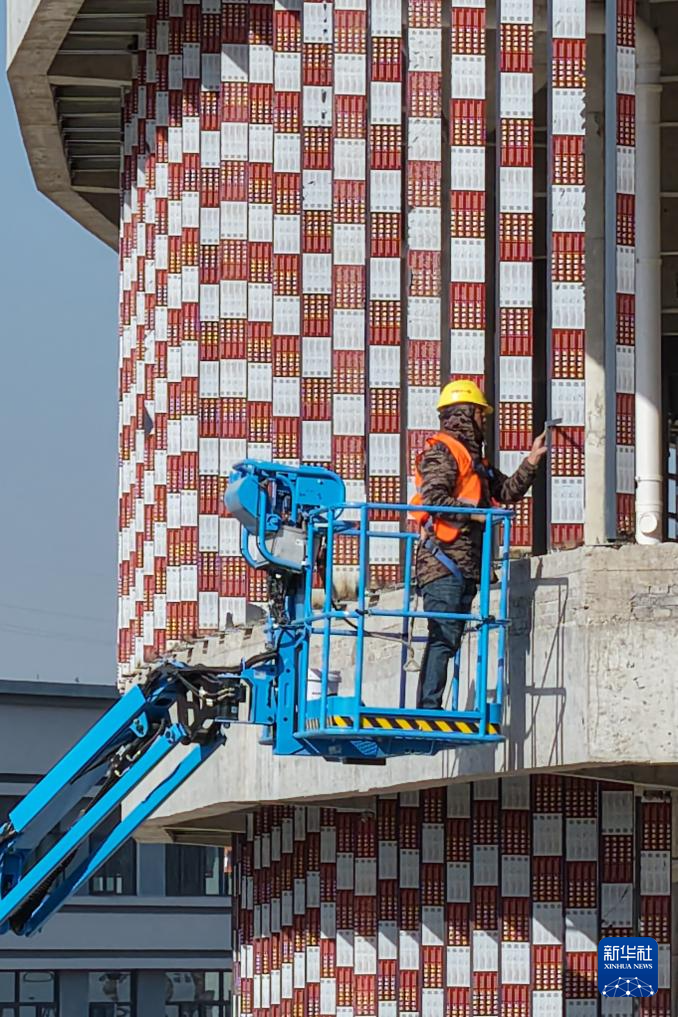 11月26日,中铁十一局建设者在浙江工业职业技术学院新昌学院综合楼进行外墙施工。