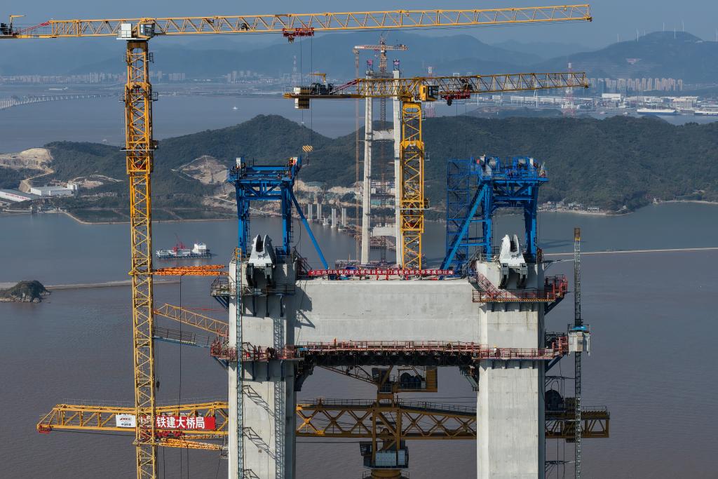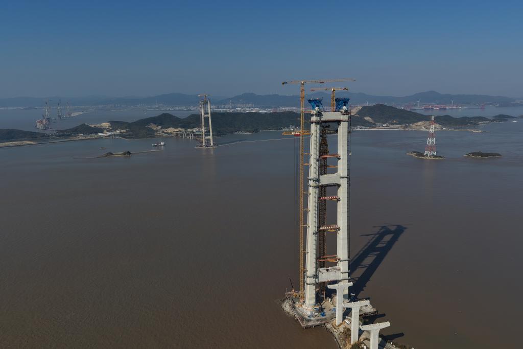 12月6日拍摄的双屿门特大桥六横侧索塔施工现场,远处为宁波舟山港梅山港区(无人机照片)。