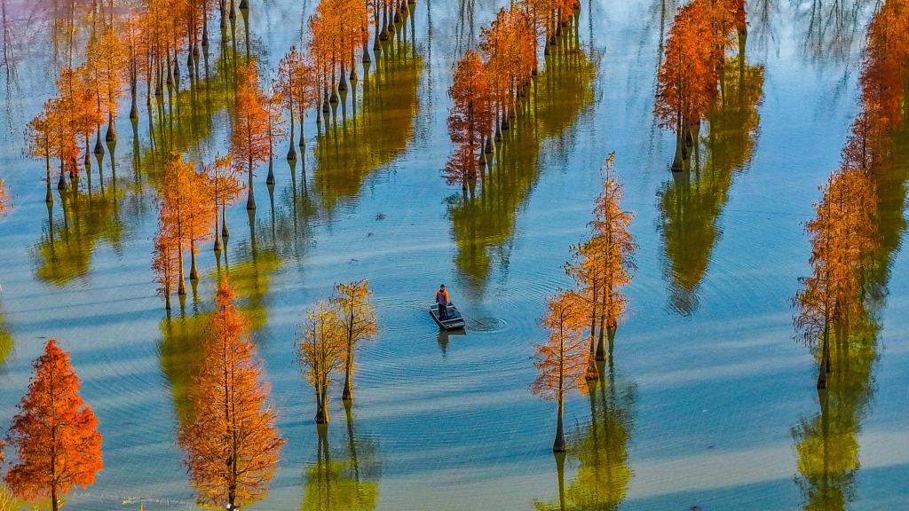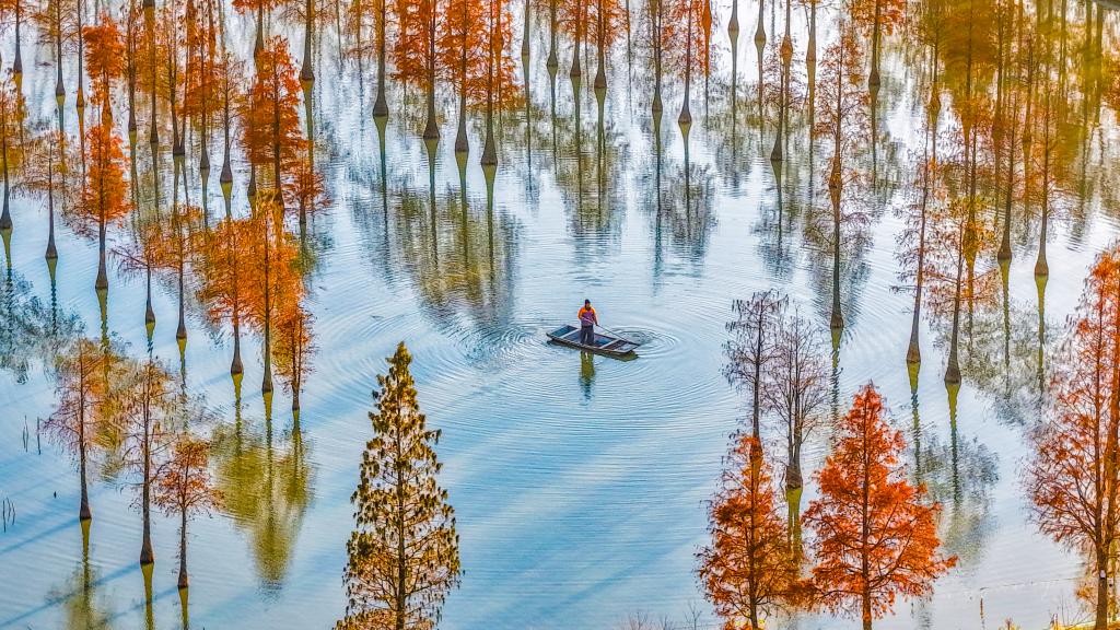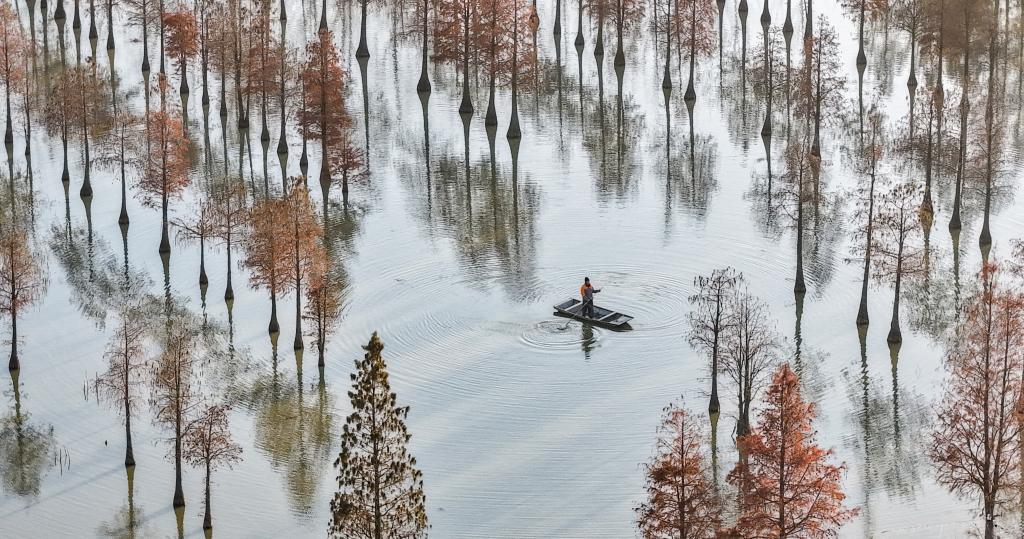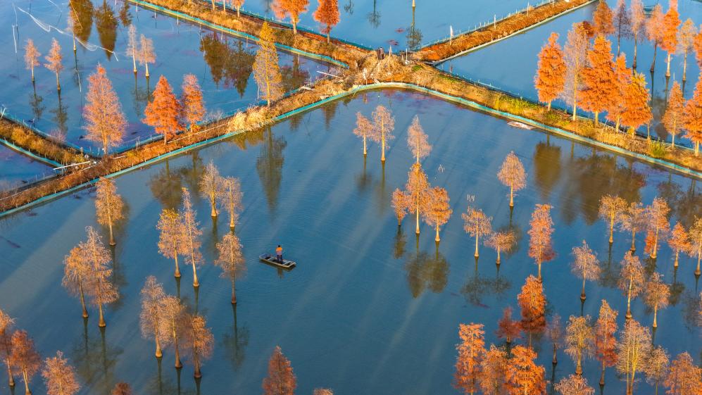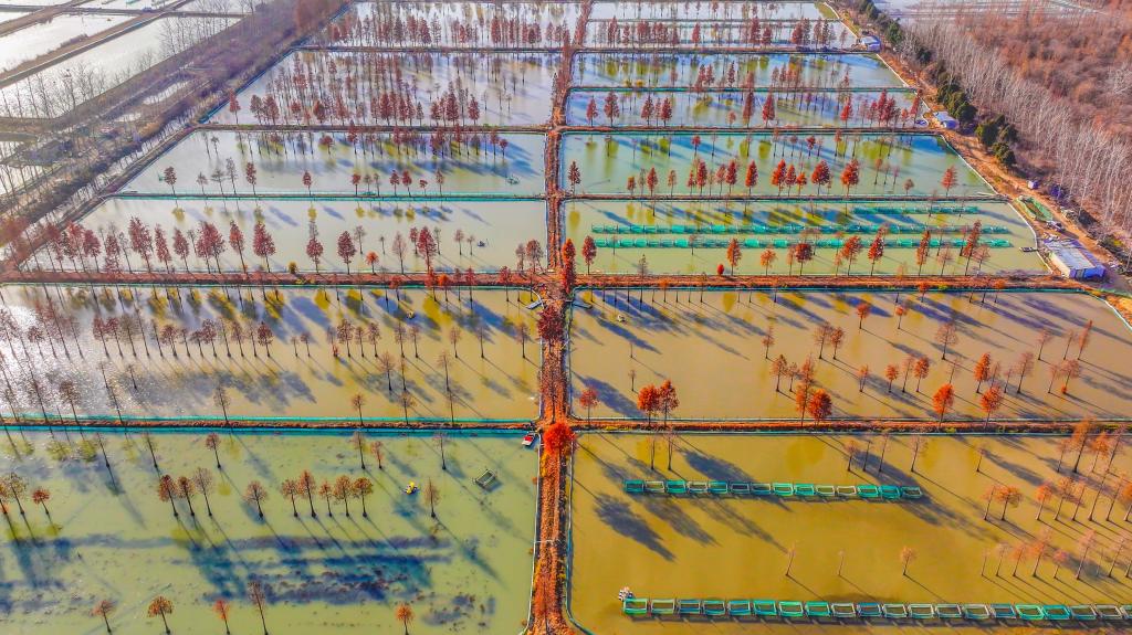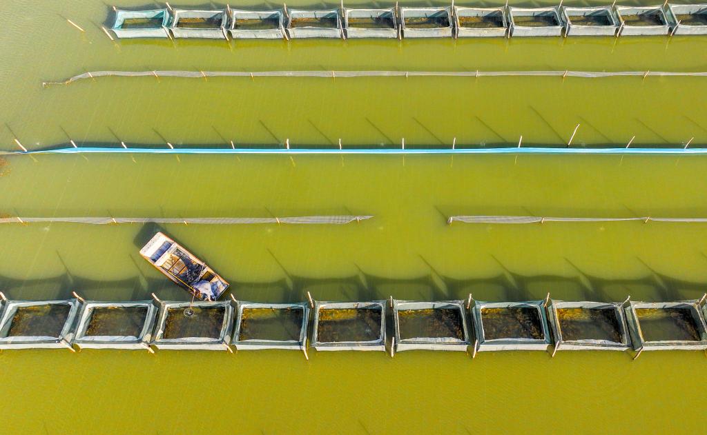 以上图片:2025年12月14日,在江苏省宿迁市泗洪县临淮镇一处螃蟹养殖基地,蟹农正对网箱、塘口进行管护。(无人机照片)CICPHOTO/刘成龙 摄