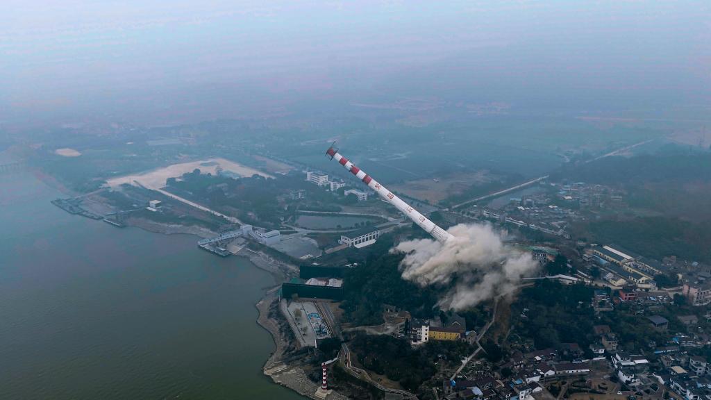 安徽省首座500千伏跨江输电塔顺利完成定向爆破拆除。(夏兵 摄)