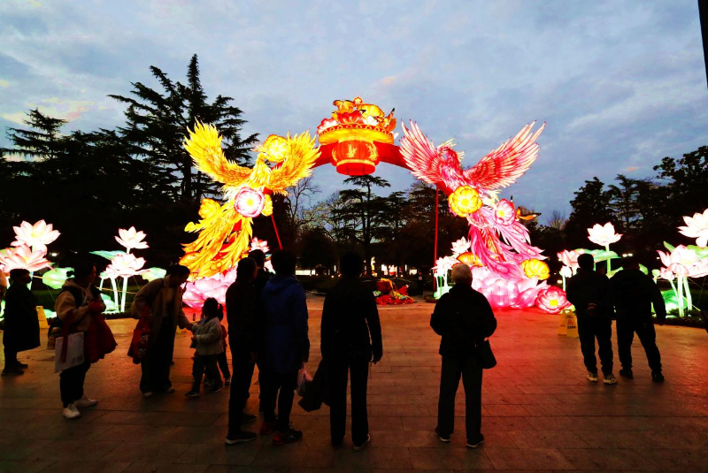 苏州公园(俗称“大公园”)位于古城区中心,是苏州第一座现代公园。其历史可追溯至春秋时期,原为吴国子城遗址,历经朝代更迭,承载着几代苏州人的集体记忆。此次非遗灯会精彩纷呈,彩灯《凤仪花境·迎宾雅筑》位于南门,双凤翩跹、牡丹盛放,取凤凰“祥瑞”、牡丹“富贵”的传统寓意。步道旁的《莲影伴行》,暖光包裹的莲影沿径铺展,粉莲与青荷相映,取意“和和美美”,为游客送上“步步皆伴祥和”的祝福。《竹韵莲鹤·姑苏新升》灯组里的清雅竹节寓意“节节高升”,荷花呼应水乡韵味,锦鲤代表顺遂,再配古韵琵琶,传递吴地雅乐风情。此外还有以唐装乐舞仕女为迎宾主角,配以竹节炮仗状装饰的《雅乐迎宾·竹炮呈祥》,《福神临苏·福满人间》萌态财神坐镇,金元宝落地……一步一景,让人目不暇接,流连忘返。