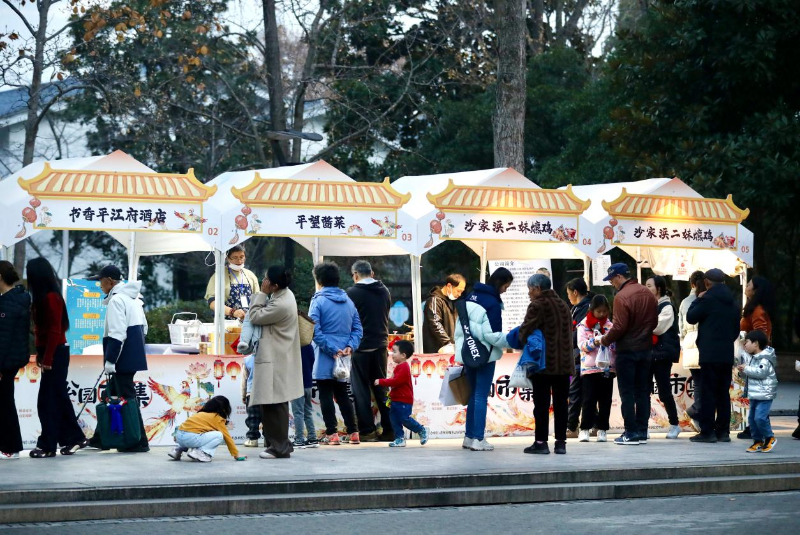 有灯,自然少不了市集的热闹。灯会期间,苏州风味市集同步开张,以地方风物为线索,公共空间为舞台,通过美食、手作与特色展位,连接市民记忆与当下生活。张家港凤凰豆腐、沙家浜爊鸡、光福蜜饯、甪直水八仙、横泾大米……地道苏味一站汇聚。甜糯糖粥、红豆小圆子、冬酿酒、现包现烧的鹅汤馄饨,赏灯之余暖身又暖心。市民游客还可以和苏派盆景等传统手艺互动,感受苏州生活的细腻与温度。