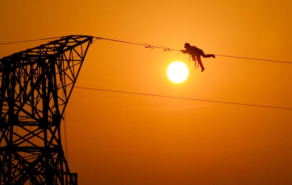 12月16日,施工人员在香涧至鹭岛500千伏线路工程施工现场进行高空作业(无人机照片)。12月17日,由安徽送变电工程有限公司施工的安徽香涧至鹭岛500千伏线路工程顺利实现主体完工。