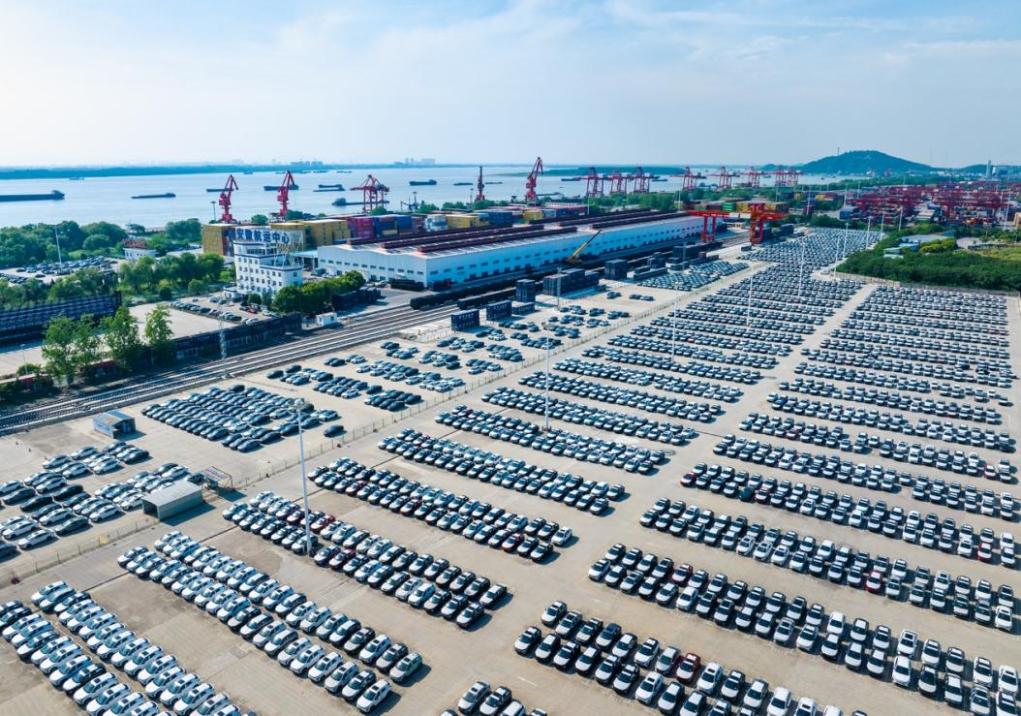 5月14日,在安徽省芜湖港朱家桥港区码头,整齐排列的汽车等待装船出口海外。(无人机照片)。新华社发(肖本祥摄)