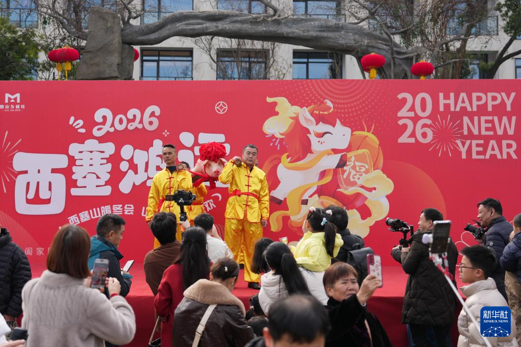 临近新年,浙江省湖州市吴兴区妙西镇“西塞山暖冬会”在龙山村泊心湾306营地举行,村民与游客一起观摩传统的杀年猪仪式,逛市集、品美食、玩游戏,体验乡村传统民俗。