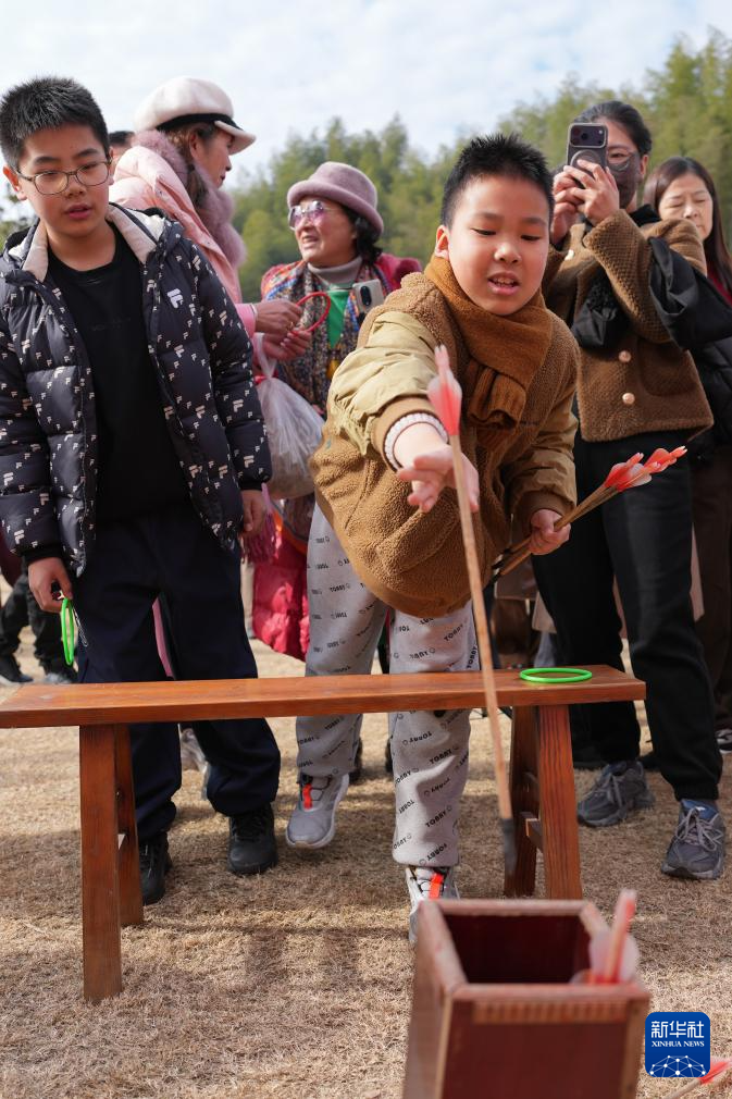 12月27日,小朋友在妙西镇龙山村参加投壶游戏。