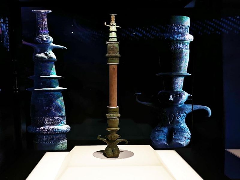 博物馆内陈列着包括良渚文化玉琮、战国原始瓷兽面鼎在内的1100余件文物。其中,青铜权杖为部落首领所持,是王权与神权的象征:杖首为跪坐人像,杖镦刻有古越人特有的“文身”纹饰,工艺精湛。战国原始瓷鼎造型古朴,兽面纹饰独特,釉色保存完好,属于高等级墓葬礼器,展现了当时原始瓷烧制的高超技艺。