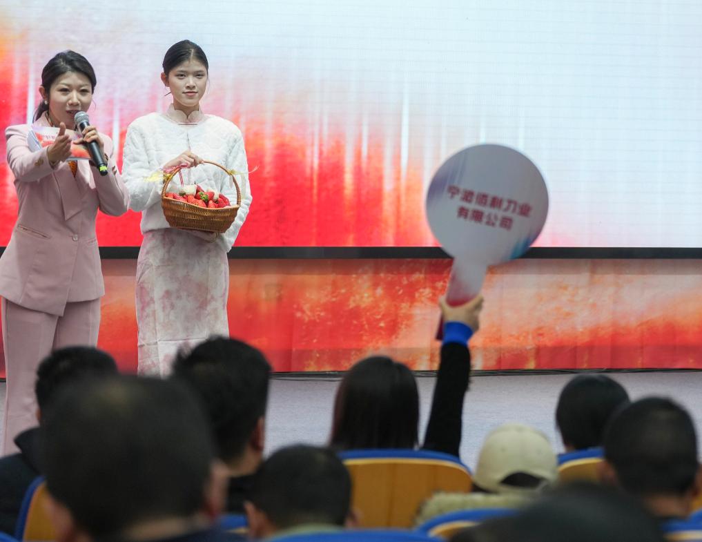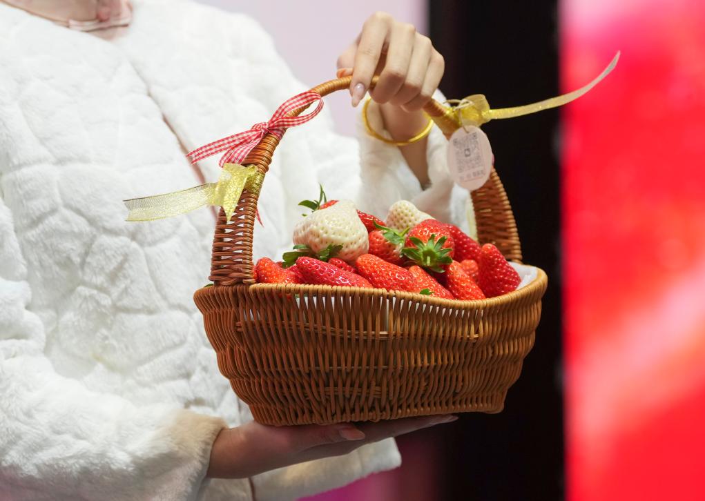 1月17日,工作人员在奉化区尚田街道举办的“草莓王争霸赛”金奖慈善拍卖会上展示用于拍卖的草莓。