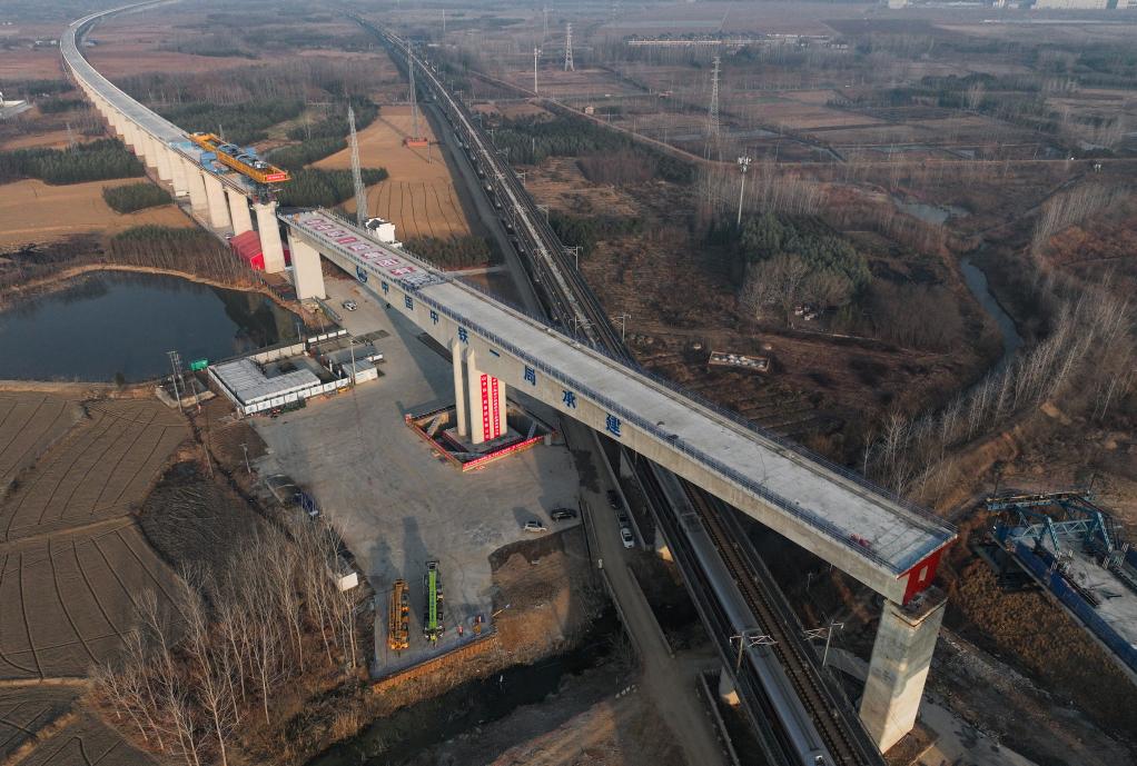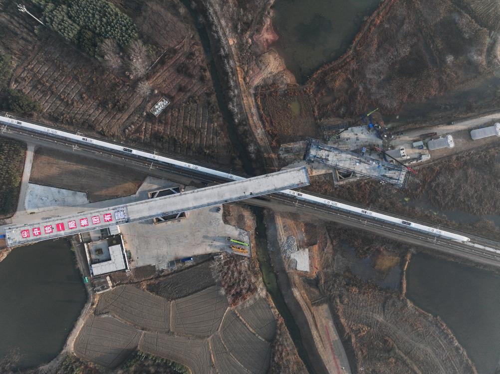 1月16日,行驶在京沪高铁线上的列车穿过沪宁合高铁跨京沪高铁立交特大桥201.5米预应力混凝土T构转体梁(无人机照片)。