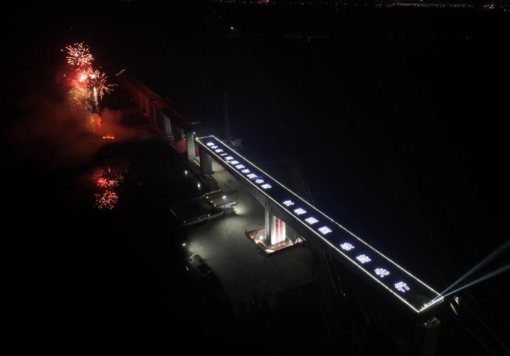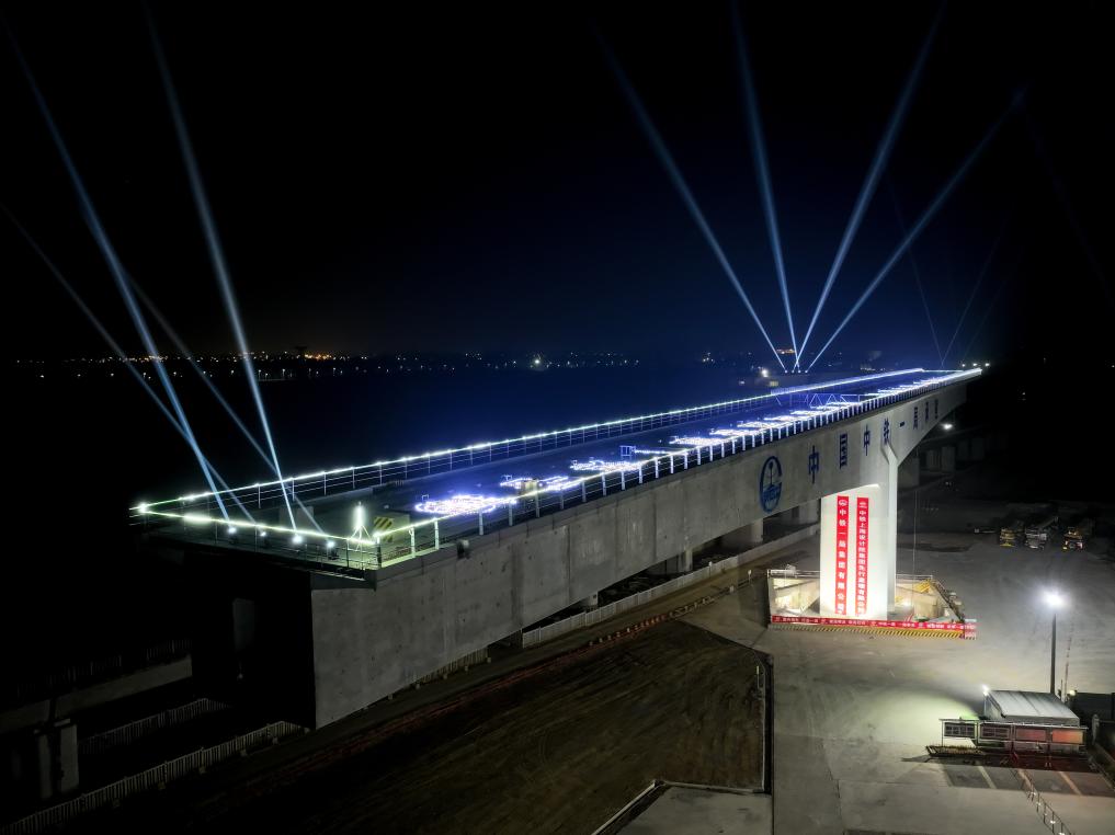 1月16日凌晨,沪宁合高铁跨京沪高铁立交特大桥201.5米预应力混凝土T构转体梁在转体施工中(无人机照片)。