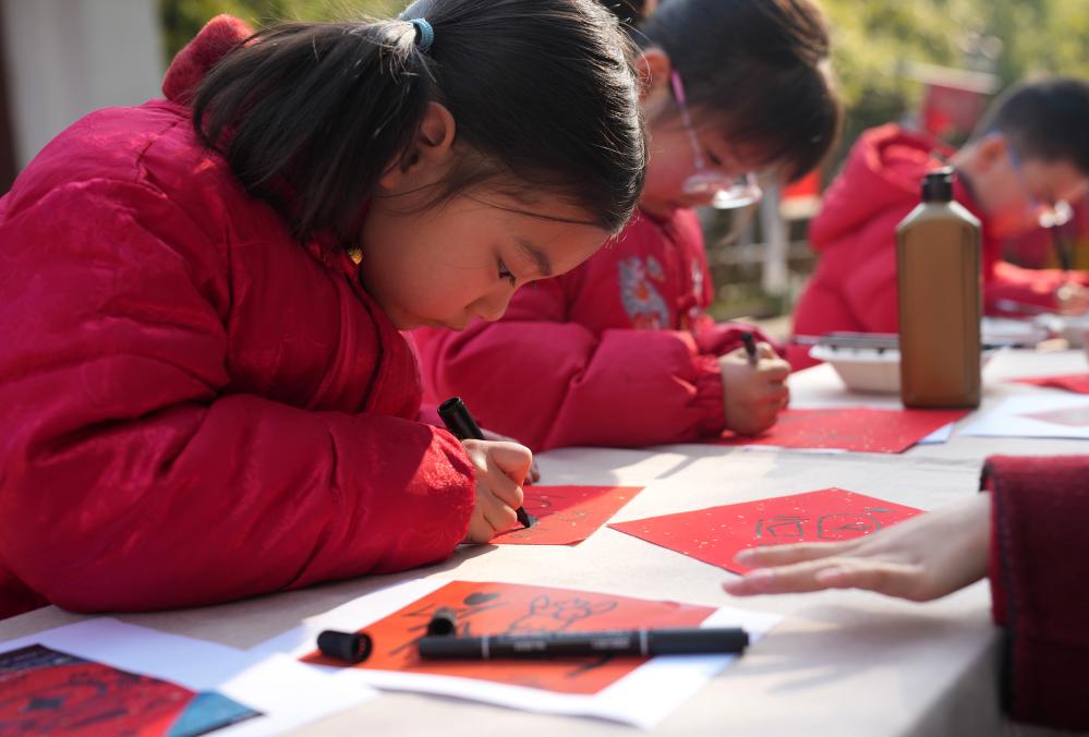 1月23日,小朋友在活动现场体验写福字。