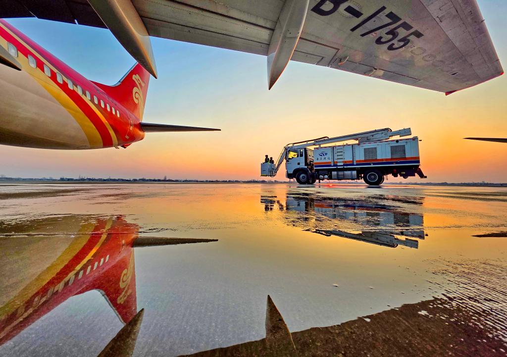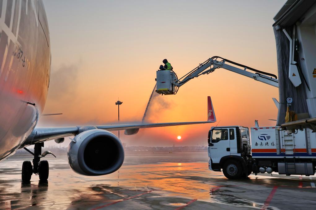 1月21日,江苏南通兴东国际机场工作人员为准备出港航班飞机除冰霜。