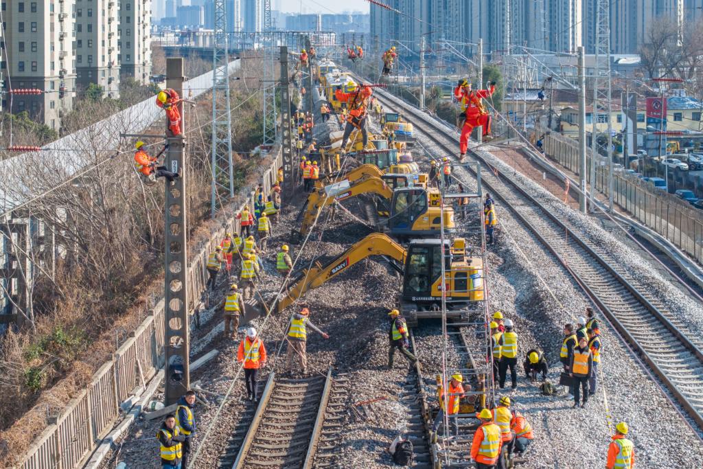 1月22日,在位于江苏省南京市浦口区的京沪线林场站,铁路工务、供电、电务等专业的职工在进行联合封锁施工作业。