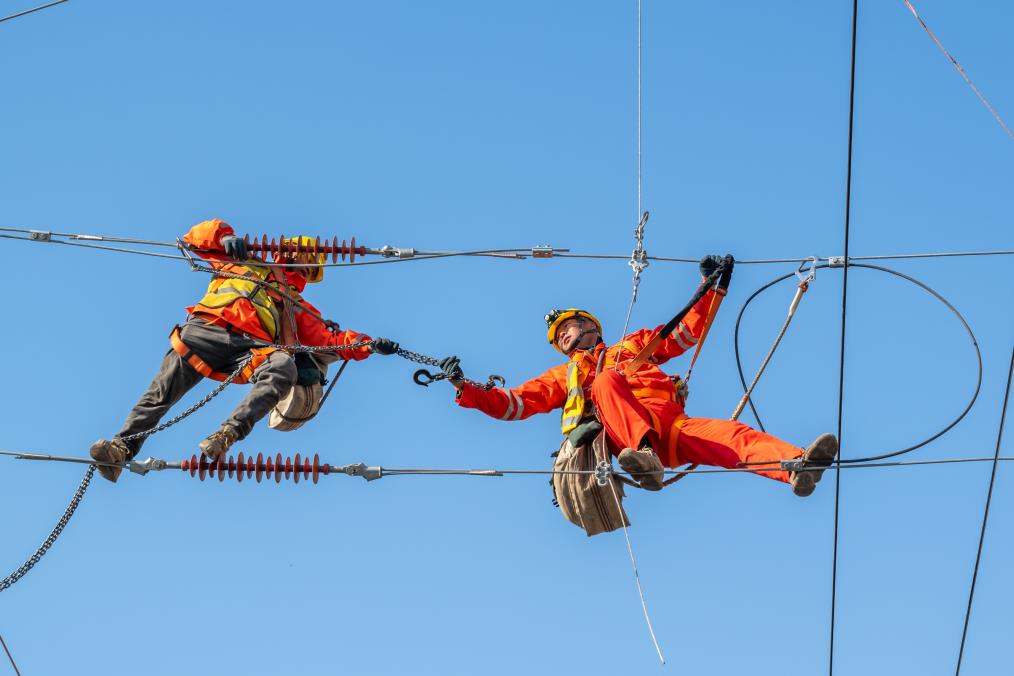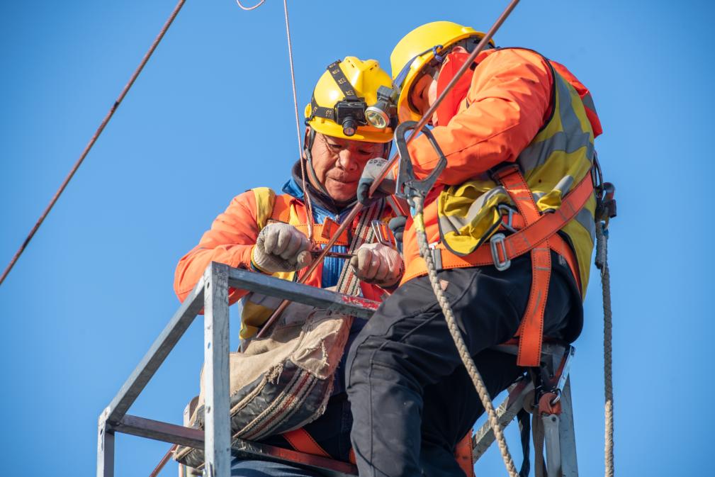1月22日,在位于江苏省南京市浦口区的京沪线林场站,铁路供电职工在进行接触网施工作业。