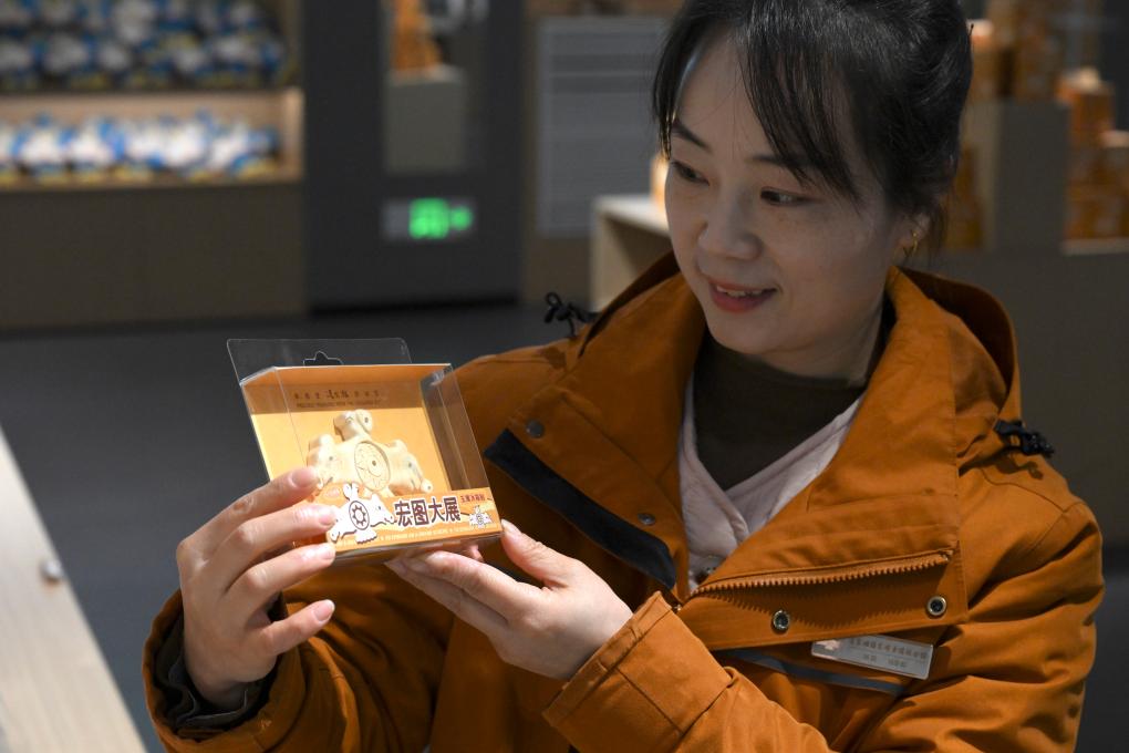 2025年12月24日,凌家滩遗址博物馆内,工作人员介绍一款考古盲盒文创产品。