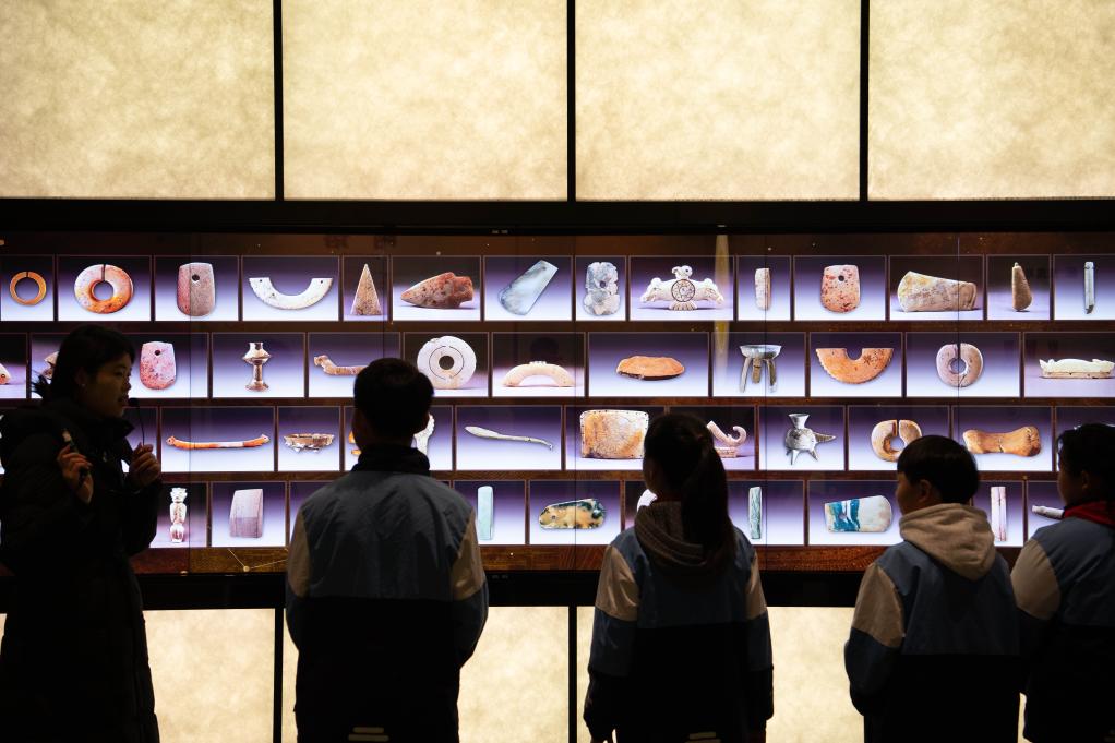1月13日,安徽省马鞍山市含山县铜闸学校的学生在凌家滩遗址博物馆参观。