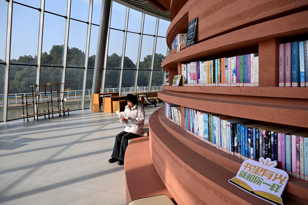 2025年12月25日,游客在凌家滩考古研学小镇内读书休闲。
