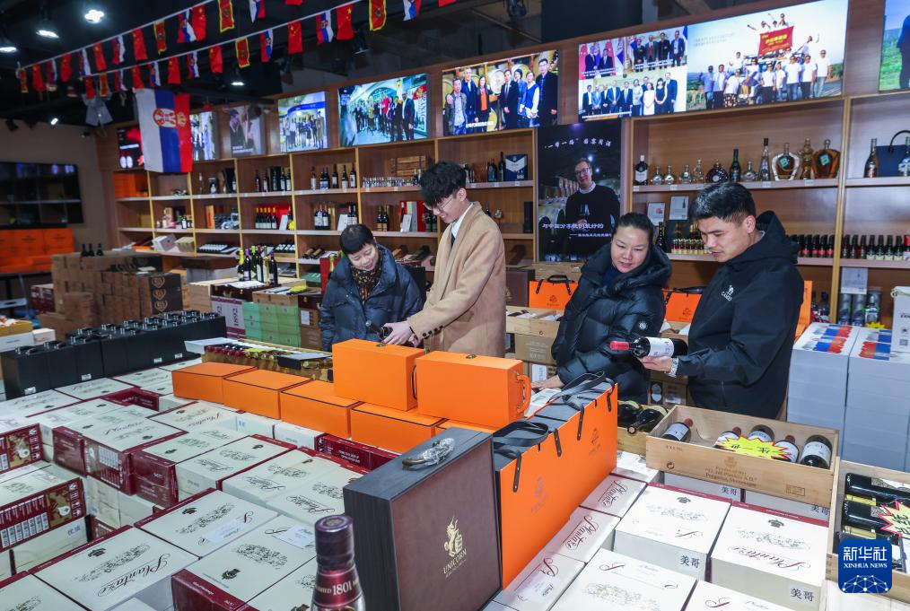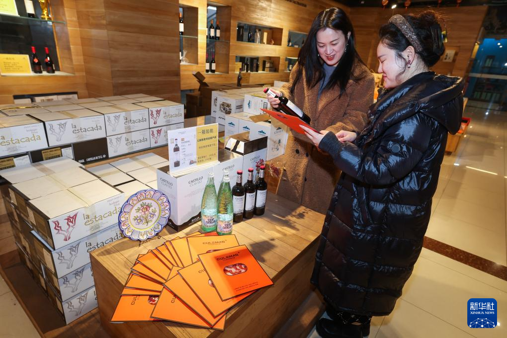1月30日,在义乌中国进口商品城一家店铺内,店员给顾客推荐塞尔维亚葡萄酒。