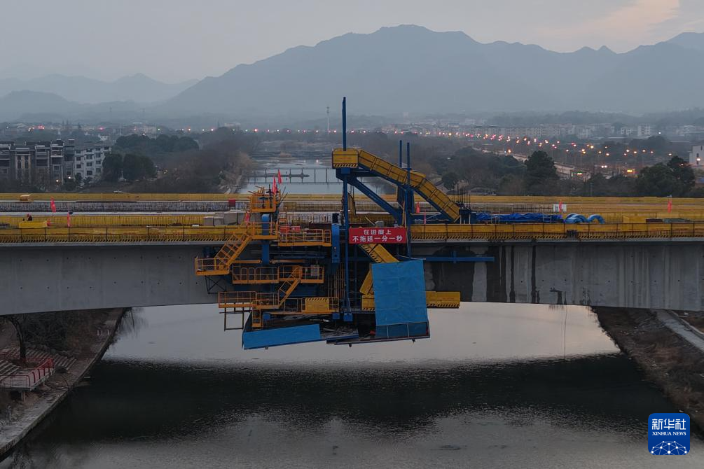 2月3日拍摄的金华铁路枢纽扩容改造项目梅溪特大桥120米连续梁合龙施工现场(无人机照片)。