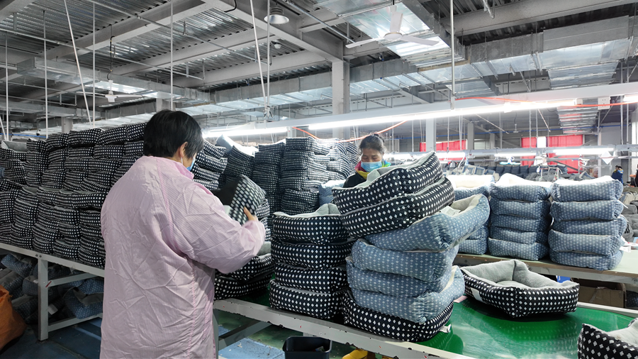 “我们针对国外客户需求设计产品,每天可生产宠物服装1万余件、狗窝猫窝一两万套,2025年企业产值突破1亿元。”该公司负责人符国富介绍。