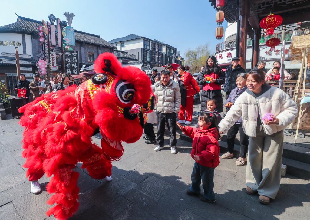 2月8日,在寿昌古镇老街上,舞狮演员跟游客互动。