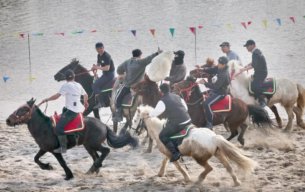 2月12日,演员在南通森林野生动物园排练“叼羊”。