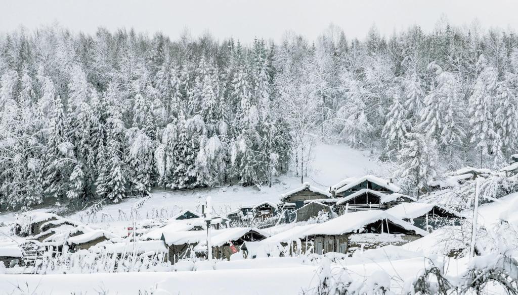 ↑这是吉林省白山市抚松县漫江镇锦江村雪景(资料照片)。锦江村入选第二批中国传统村落,拥有保存完整的满族古木屋建筑群。