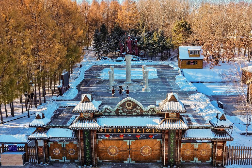 ↑在黑龙江省佳木斯市同江市街津口赫哲族乡,赫哲族群众在民族文化村里进行文艺活动(无人机照片,2025年11月18日摄)。街津口赫哲族乡(渔业村)街津口村入选第五批中国传统村落,与俄罗斯隔江相望,村落里生活的赫哲族人以捕鱼为传统,保留着鱼皮制作等非物质文化遗产。