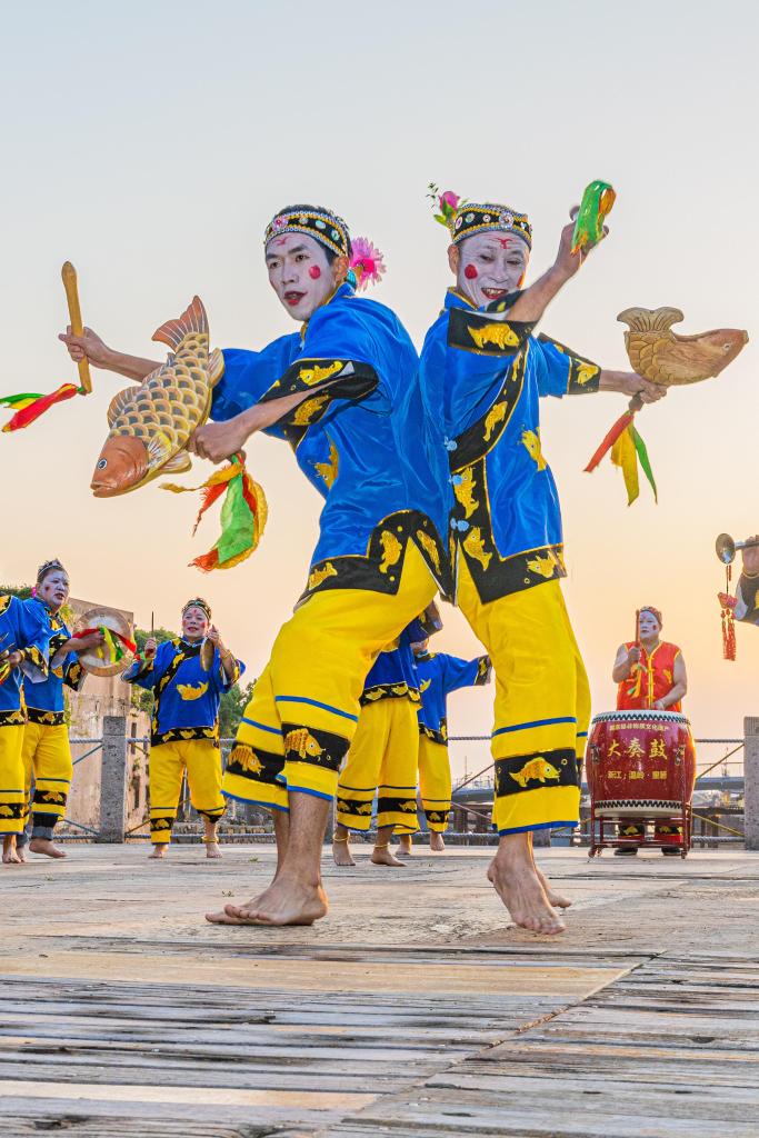 ↑在浙江省温岭市石塘镇里箬村的广场上,村民身着特色服饰,手持乐器,练习国家级非物质文化遗产大奏鼓(2025年4月29日摄)。里箬村入选第二批中国传统村落,位于浙江省温岭市石塘镇箬山海岛上,村民会在重要节庆时跳起独具特色的国家级非遗大奏鼓。