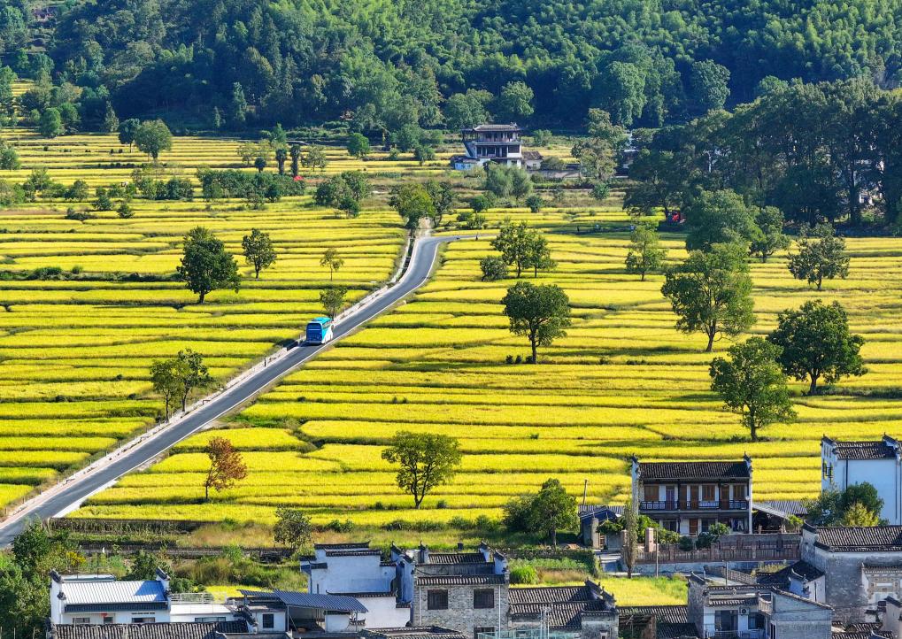 ↑这是安徽省黄山市黟县宏村镇塔川村稻田景色(无人机照片,2025年10月16日摄)。塔川村入选第二批中国传统村落,古老的徽派建筑依山而建,“塔川秋色”被誉为全国四大秋色之一。