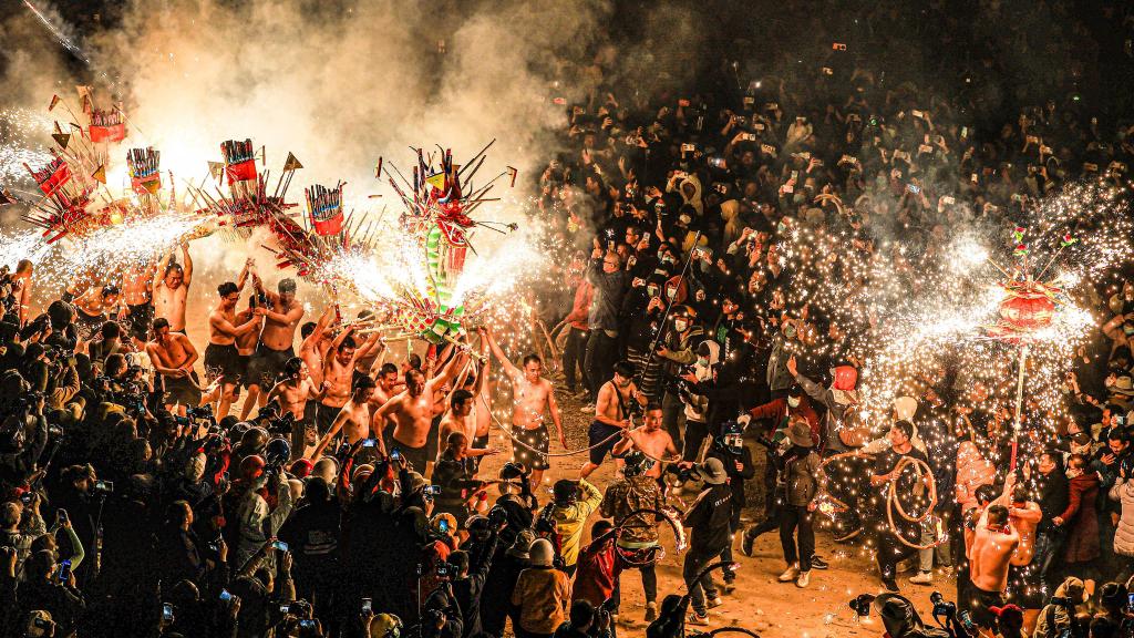 ↑人们在广东省梅州市丰顺县埔寨镇埔南村表演火龙(2024年2月24日摄)。埔南村入选第二批中国传统村落。埔寨火龙是当地村民闹元宵的独特传统节目,每逢新春佳节,人们用竹篾扎成“龙身”,内装各式各样的烟花、爆竹,用纸裱面,绘上色彩,栩栩如生。