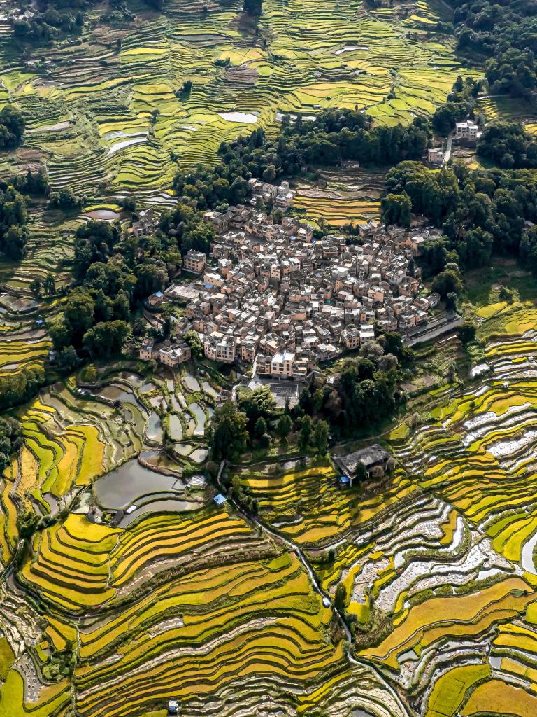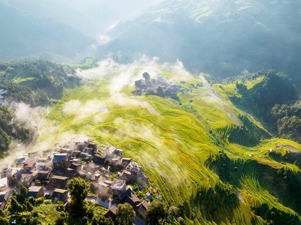 ↑这是云南省红河哈尼族彝族自治州元阳县新街镇土锅寨村箐口村(无人机照片,2025年9月6日摄)。箐口村入选第三批中国传统村落,以被列入世界遗产名录的哈尼梯田为特色。
