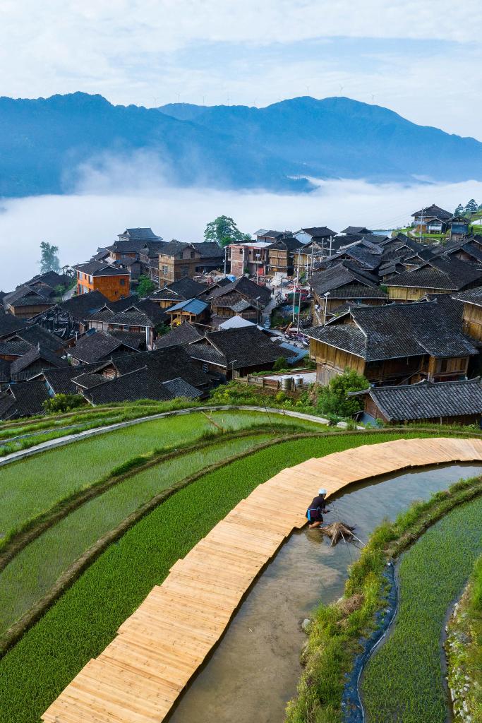 ↑这是贵州省从江县加榜乡加车村(无人机照片,2025年5月1日摄)。加车村入选第二批中国传统村落,以梯田景观和苗族吊脚楼群著称。