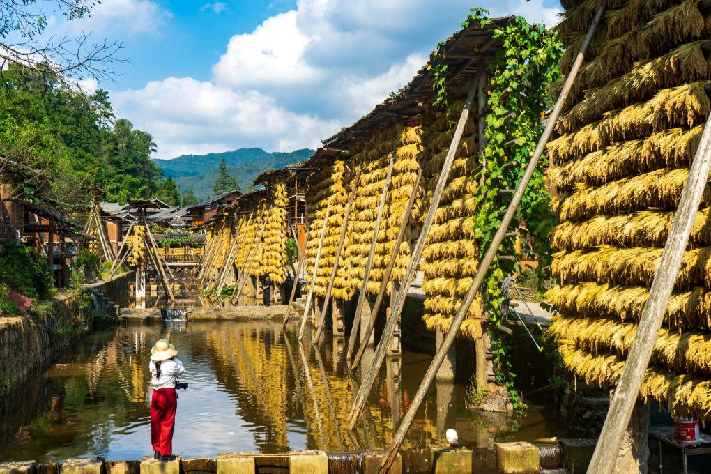 ↑贵州省从江县高增乡占里村禾晾景观(2025年10月17日摄)。占里村入选第三批中国传统村落,古色古香的吊脚楼民居与绿水青山、侗族鼓楼等交相辉映。