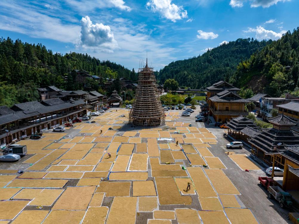 ↑村民在贵州省从江县高增乡小黄村晾晒稻谷(无人机照片,2025年9月15日摄)。小黄村入选第三批中国传统村落,被誉为侗族大歌的发源地。