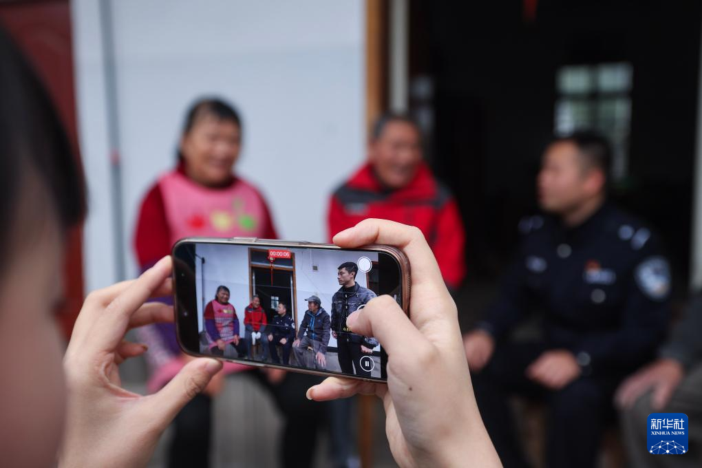 2月27日,赵家镇年轻基层干部拍摄派出所民警和村干部入户走访百姓、调解纠纷的视频。
