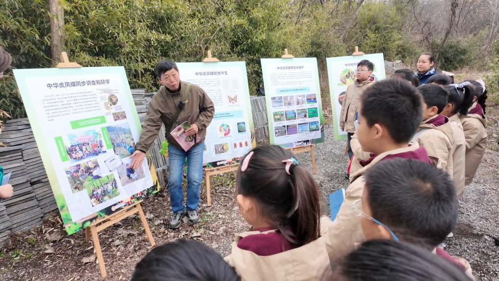 在南京汤山,南京生态文明公益讲师张松奎带领孩子们,从观察一只蝴蝶、了解一朵花开始,感知气候变化对生态的影响。