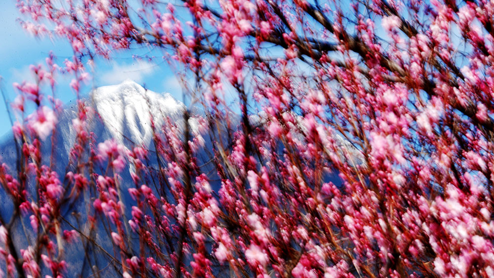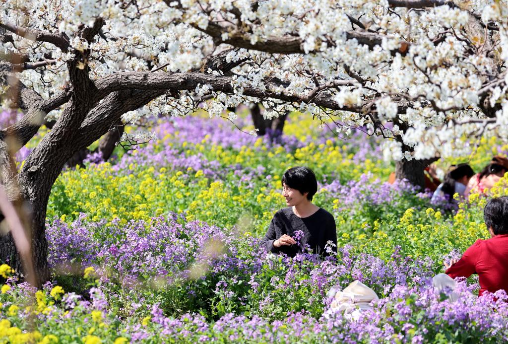 每年三月中下旬开始,在北京居庸关长城脚下,山花相继绽放。北京市郊铁路S2线的一列列火车穿行于花海间,成为春日里的一道美丽风景。
