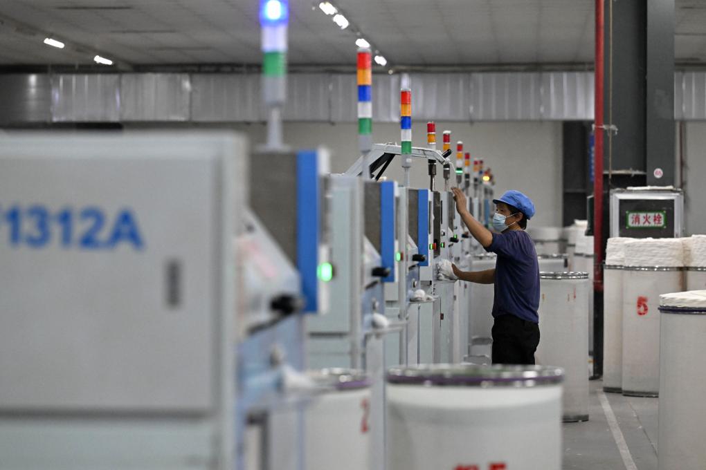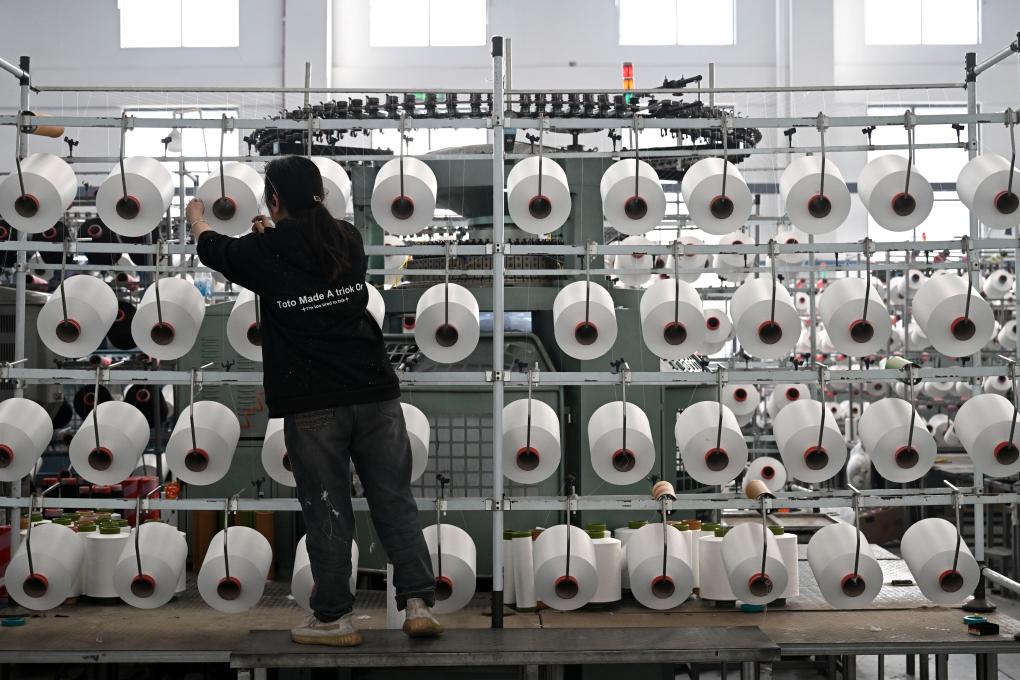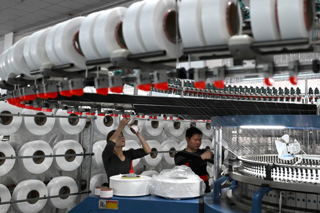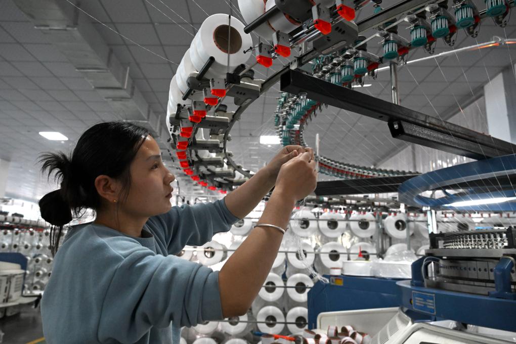 3月12日,工作人员在蚌埠市五河县一家纺织企业生产车间内工作。