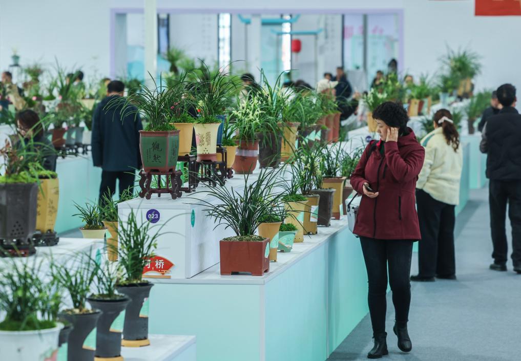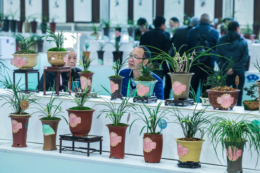 3月13日,观众在春兰大集现场观赏获得金奖的兰花。