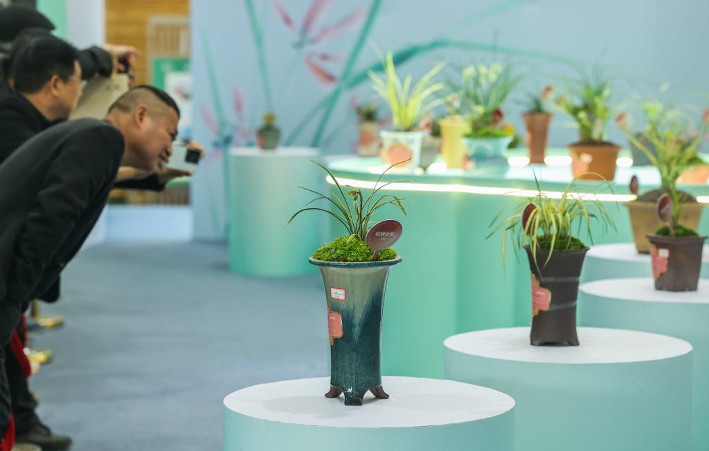 这是3月13日拍摄的春兰大集现场展示的兰花。