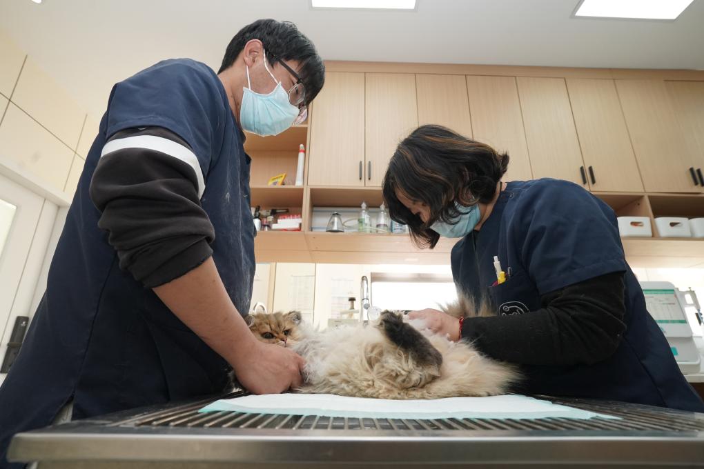 2月3日,在无锡关爱宠物医院,医护人员给宠物猫剃毛。