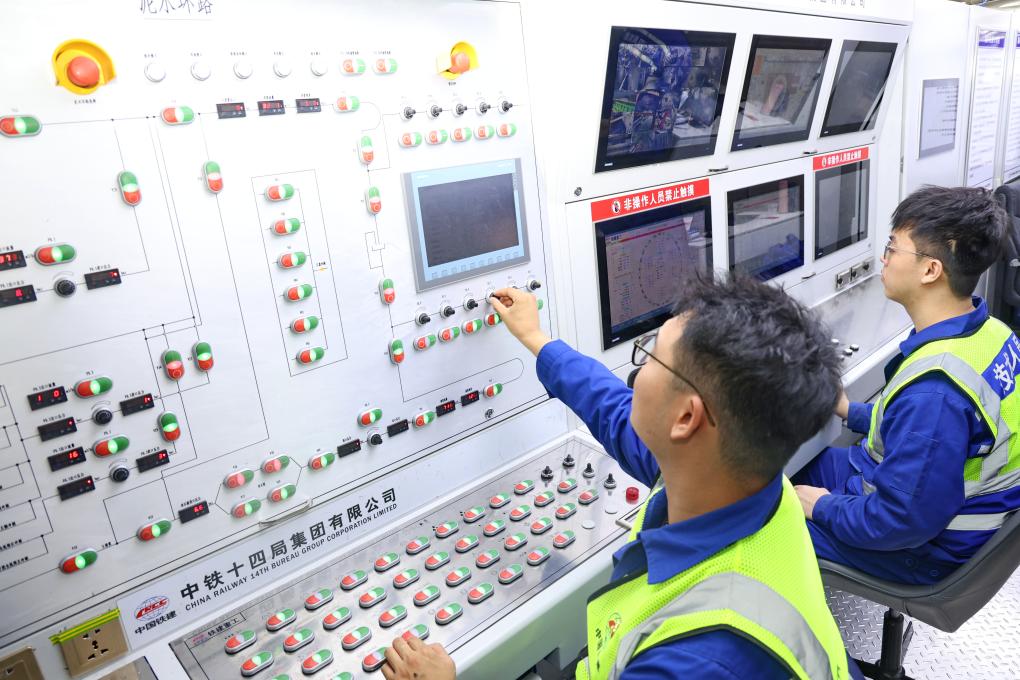 3月22日,中铁十四局技术人员在海太长江隧道盾构机操作室内工作。