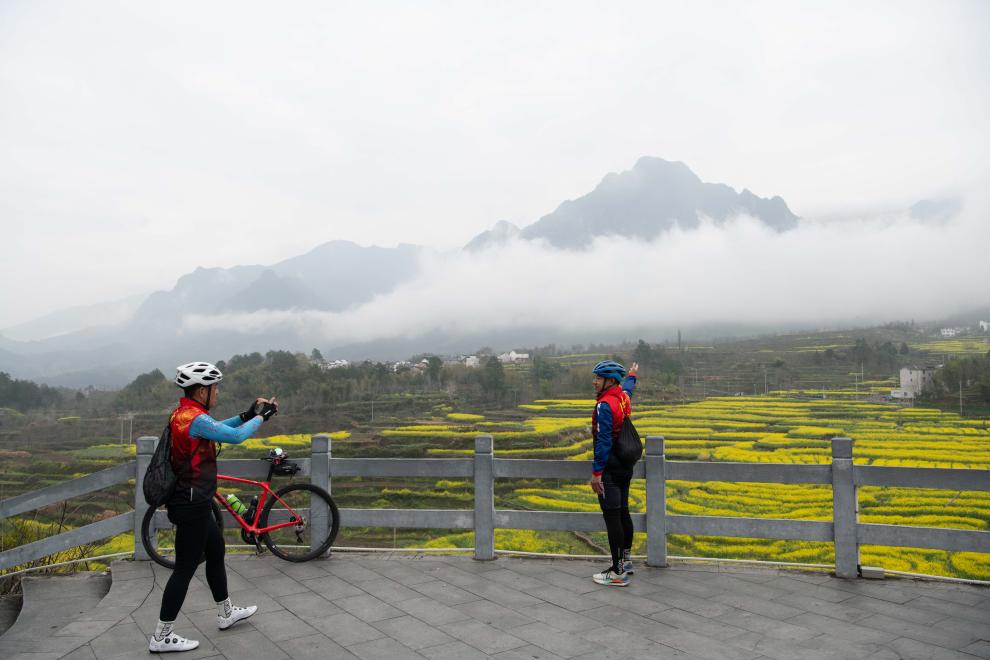 3月23日,骑行爱好者在幸福村梅干岭油菜花田附近的观景台拍照。