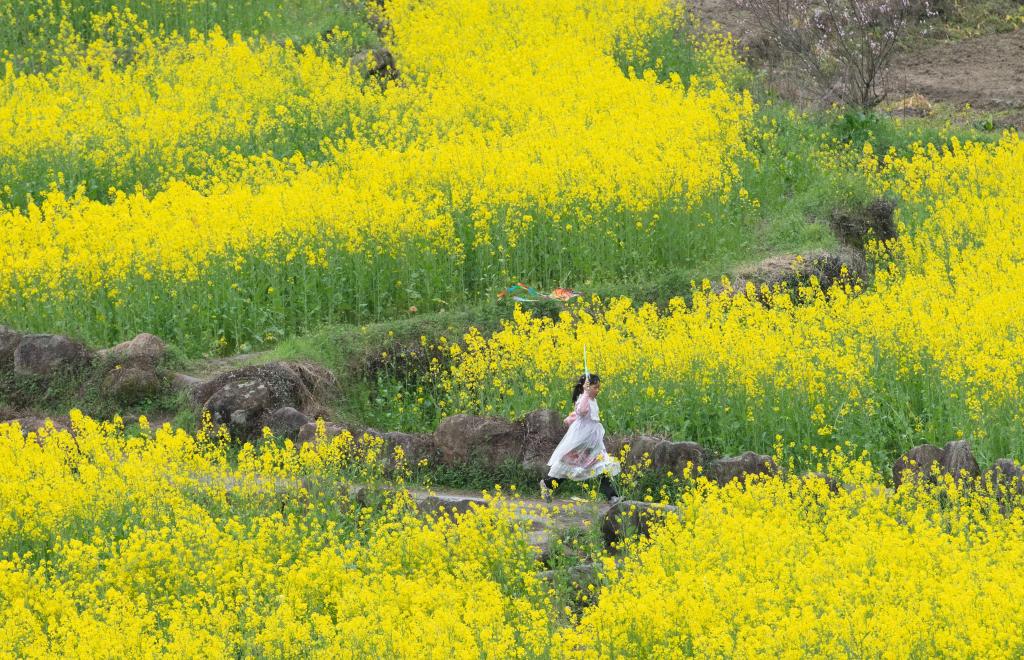 眼下,安徽省宣城市绩溪县家朋乡幸福村的油菜花田进入盛花期,大批游客来此踏青赏花。