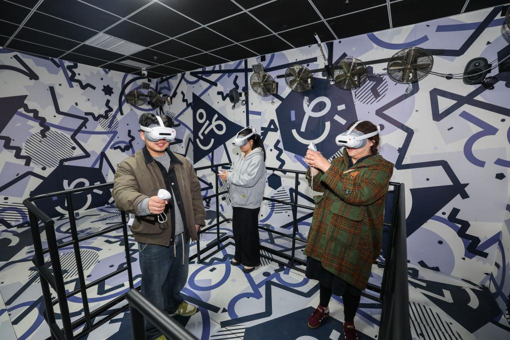 3月24日,在嘉兴市南湖区“翼时空·嘉兴1921”机遇时空体验馆内,游客佩戴VR设备在虚拟场景中互动体验。
