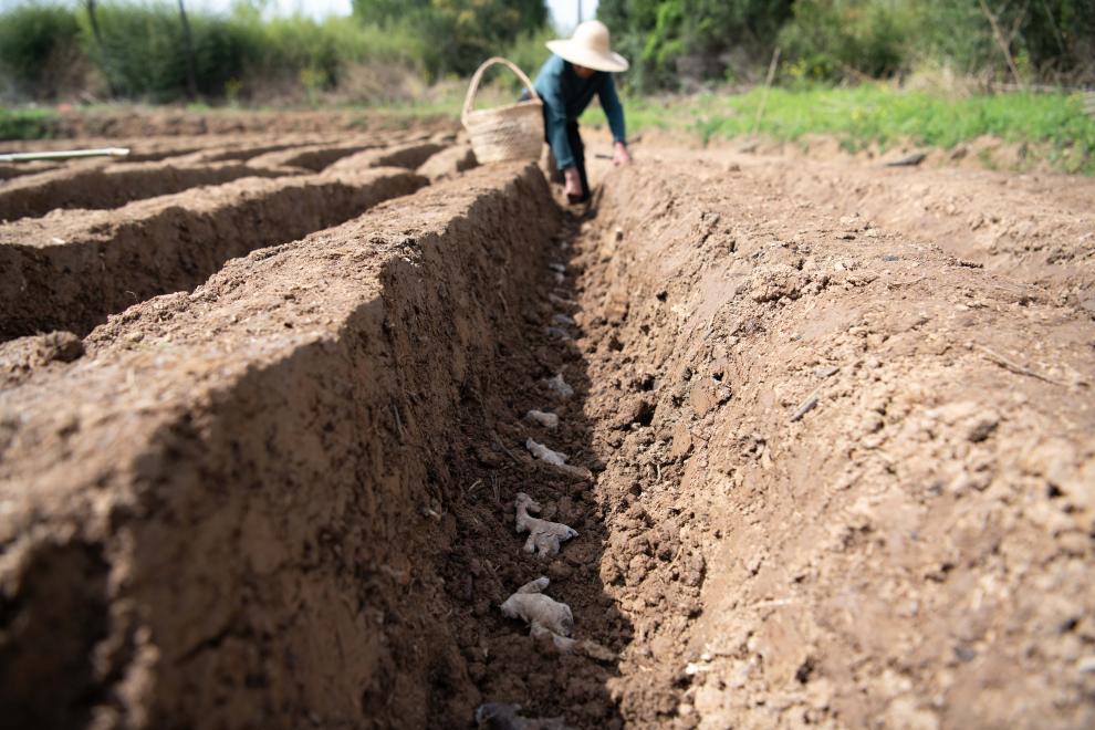 4月5日,在安徽省铜陵市郊区大通镇大院村,农民在种植白姜。