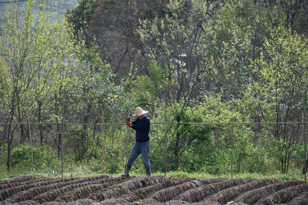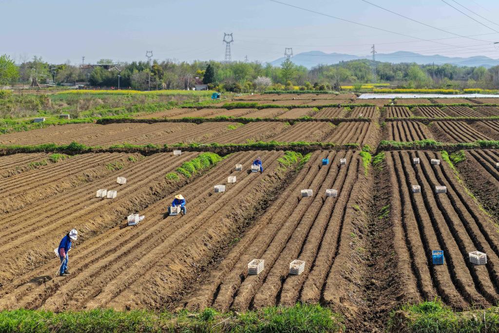 4月2日,在安徽省铜陵市义安区天门镇,农民在姜田里劳作(无人机照片)。
