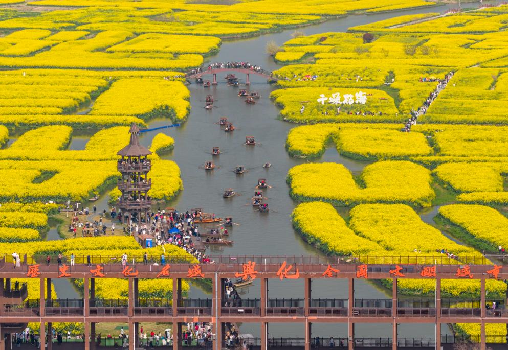 4月4日,游客在江苏省兴化市千垛景区赏花游玩(无人机照片)。